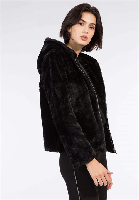 new. Encontre as últimas tendências na coleção com peças bonitas e de qualidade. Penduro metálico com emblema no interior. Aperta com fecho e molas. Casaco Pelo Preto Com Capuz.